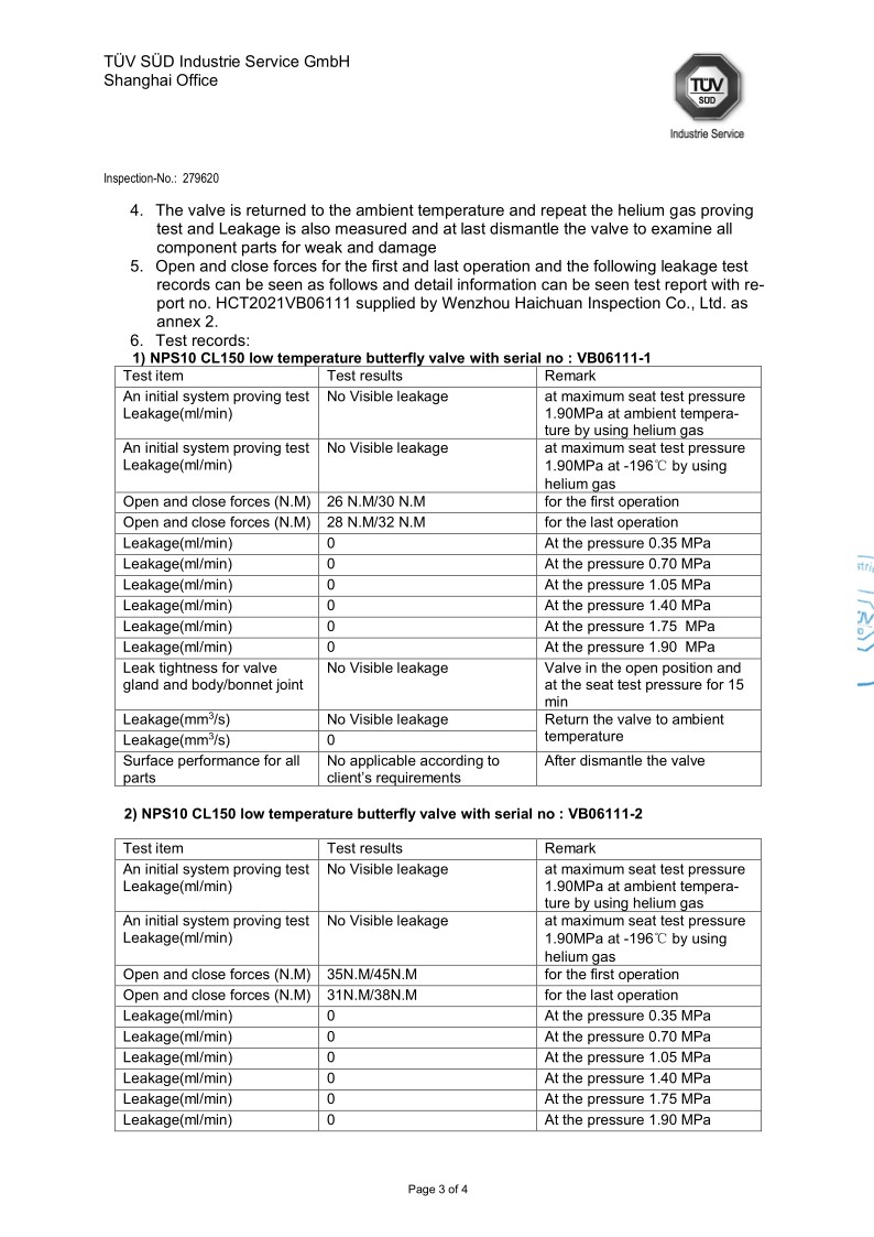 TUV低温蝶阀BS6364:1984认证证书 | ||