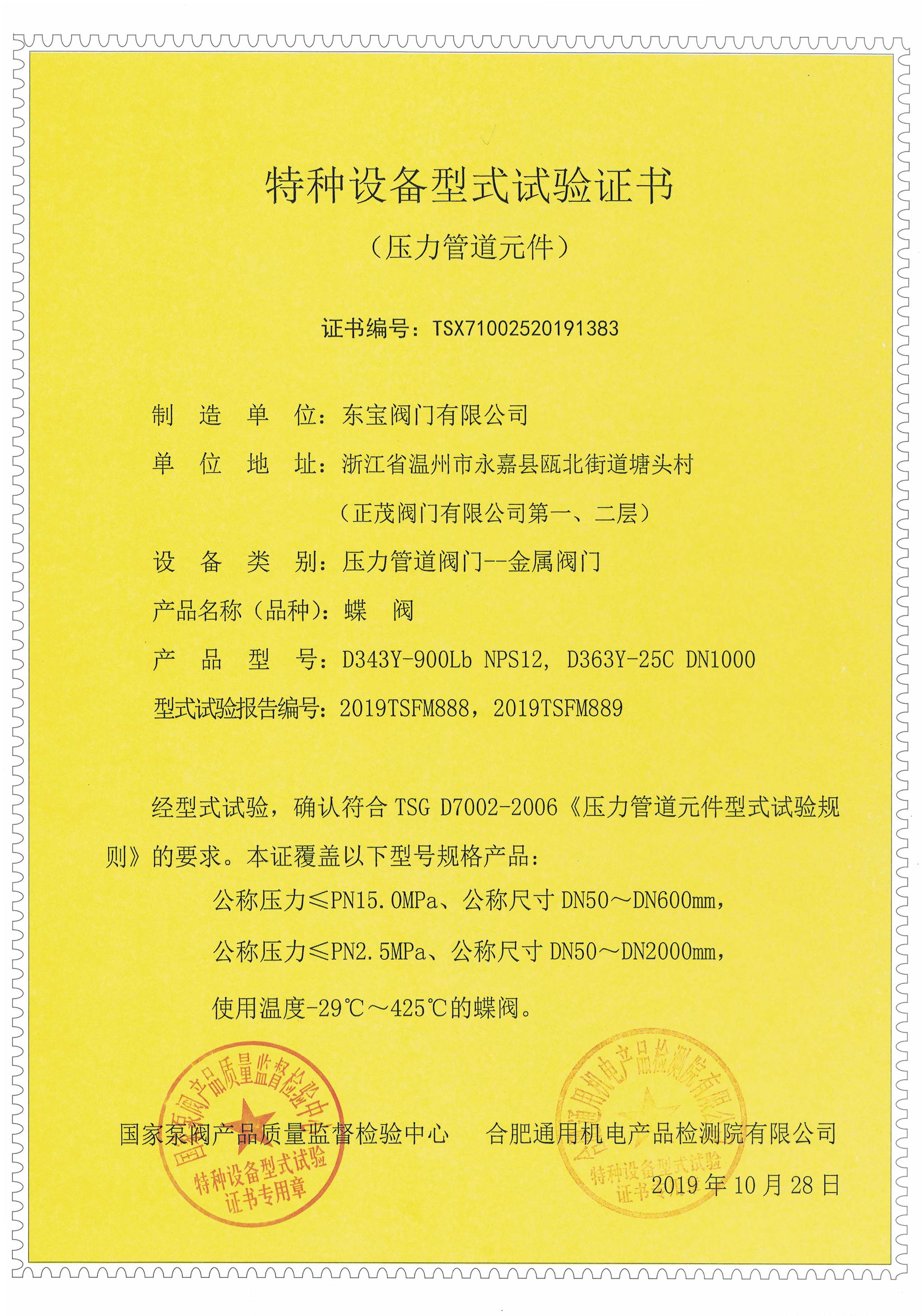 蝶阀(A1级)特种设备型式试验证书 | ||