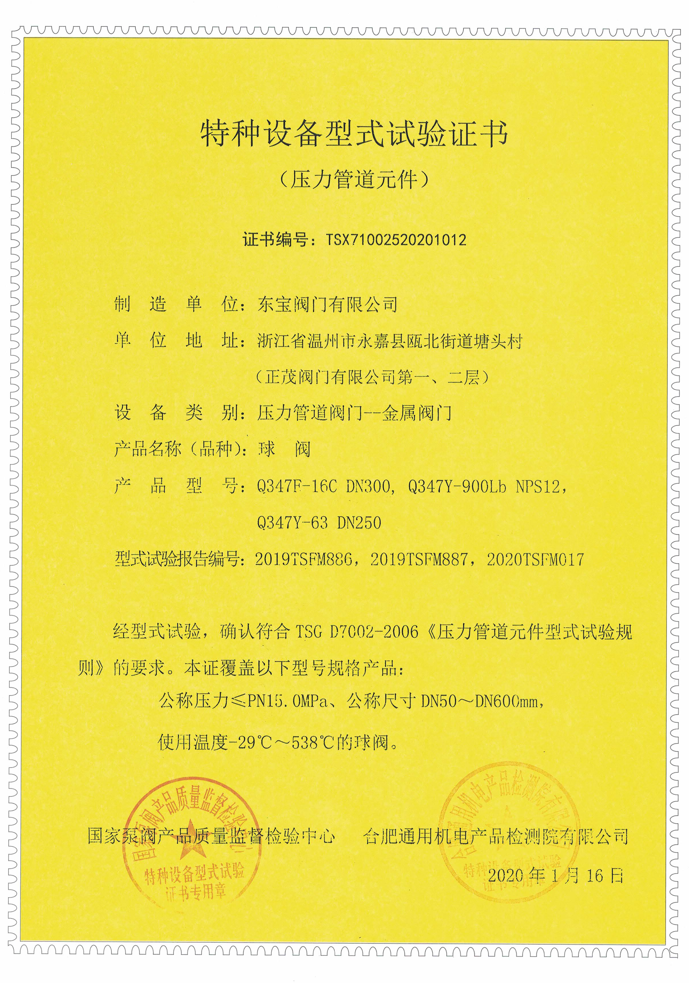| 球阀(A1级)特种设备型式试验证书 | ||