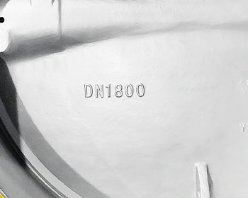 三偏心蝶阀阀体材料:Q245R 蝶板:WCB 阀杆:A182 F6A。阀座:SS304+石墨 公称直径:DN1800 公称压力:PN6对焊式